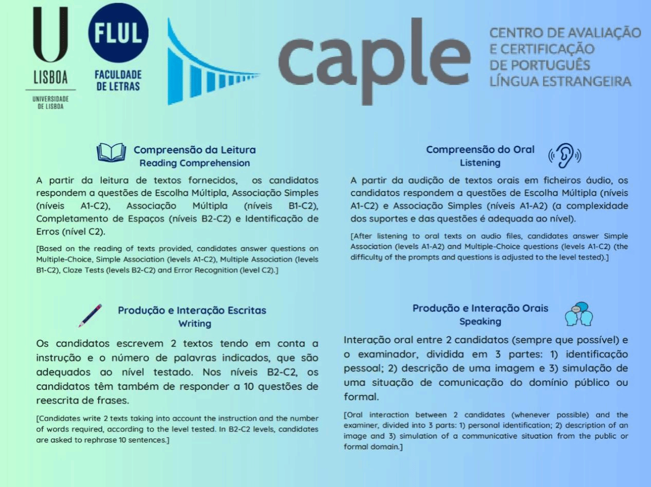 3003新葡官方网站CAPLE考点将于2025年5月6至8日举行CAPLE葡萄牙语水平测试。各级别开放名额分别为:CIPLE 16人、DIPLE 33人、DAPLE 26人、DUPLE 15人,报名截止日期为2025年4月14日。各级别具体考试日期请参见CAPLE考试中心官网(http://caple.letras.ulisboa.pt/)。